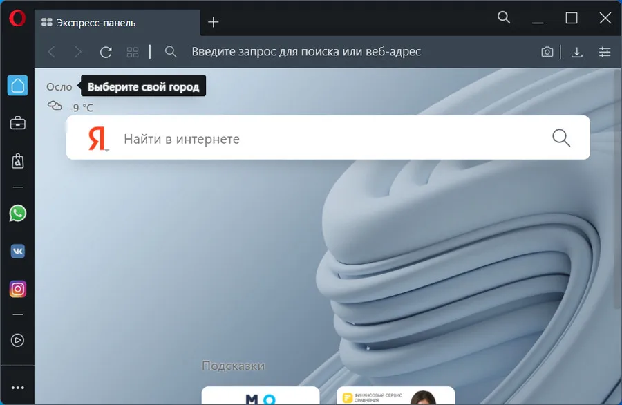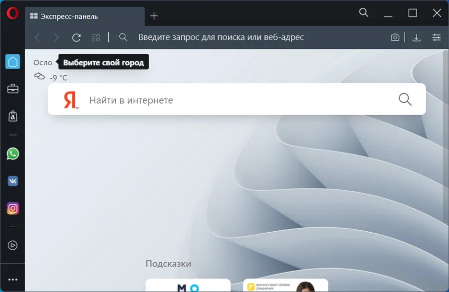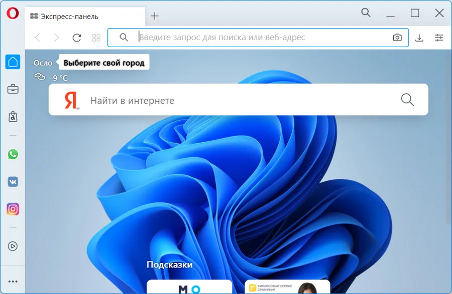 Ещё один браузер, который можно условно назвать поддержавшим тренд стиля Windows 11 – Opera. В плане непосредственно оформления интерфейса Opera никак не адаптирована к стилю и формату Windows 11, но после выпуска новой операционной системы в числе фоновых обоев этого браузера появились картинки в стиле динамичного цветка Bloom - символа Windows 11. Для фона Opera можем выбрать объект типа вариации Bloom. Как и оригинальный Bloom от Microsoft, цветок есть для светлой темы браузера.