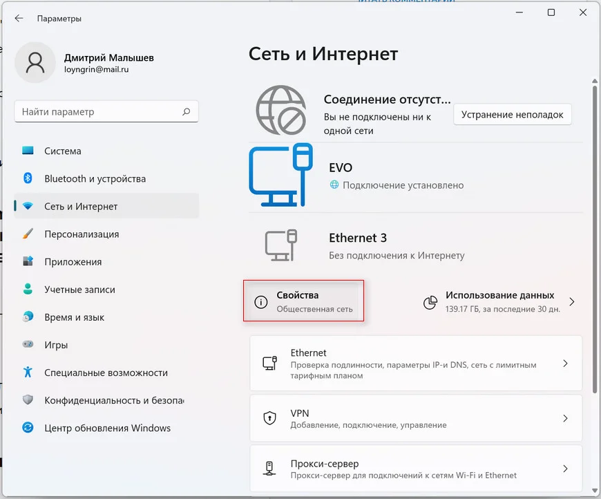 2. Находим строку "Сеть и интернет" и кликаем по ней. В зависимости от того проводной у вас интернет или беспроводной выбираем, соответственно, "Wi-Fi" либо "Ethernet".