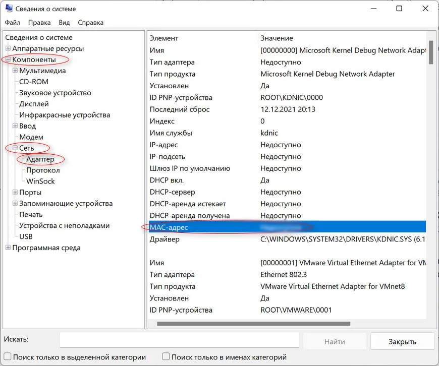 3. В появившемся окне слева переходим по пути "Компоненты", далее "Сеть", затем "Адаптер".