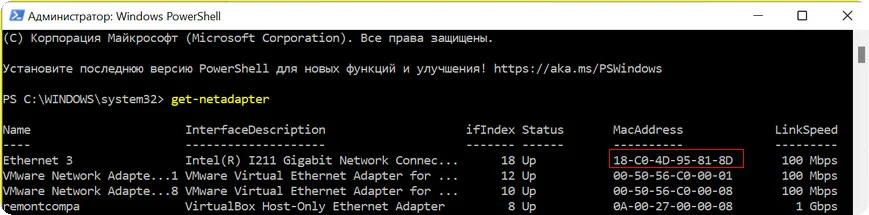 2. Прописываем команду "get-netadapter" и жмем Enter.