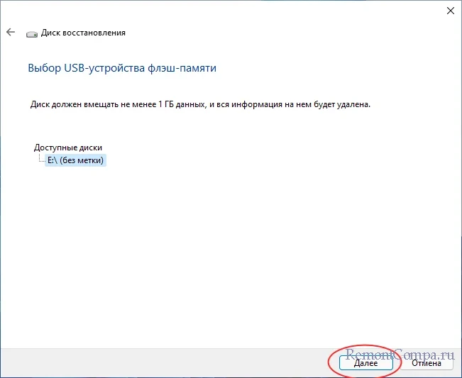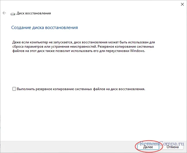 Если вы не планируете использовать загрузочную флешку для переустановки системы, снимите флажок с опции «Выполнить резервное копирование системных файлов на диск восстановления» и нажмите «Далее». Приняв во внимание, что с подключенного накопителя будут удалены все данные, нажмите «Далее» и подтвердите операцию записи нажатием «Создать» в следующем окне.