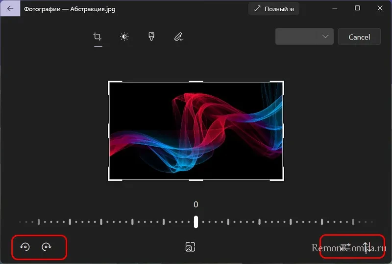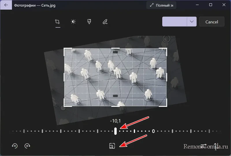 Эта среда сменила интерфейс на новый, более соответствующий стилю Windows 11. И более удобный с точки зрения юзабилити. Сразу нам доступна функция поворота изображения по диагонали, поворот осуществляется перетягиваем ползунка по шкале. И доступна нам функция обрезки изображения.