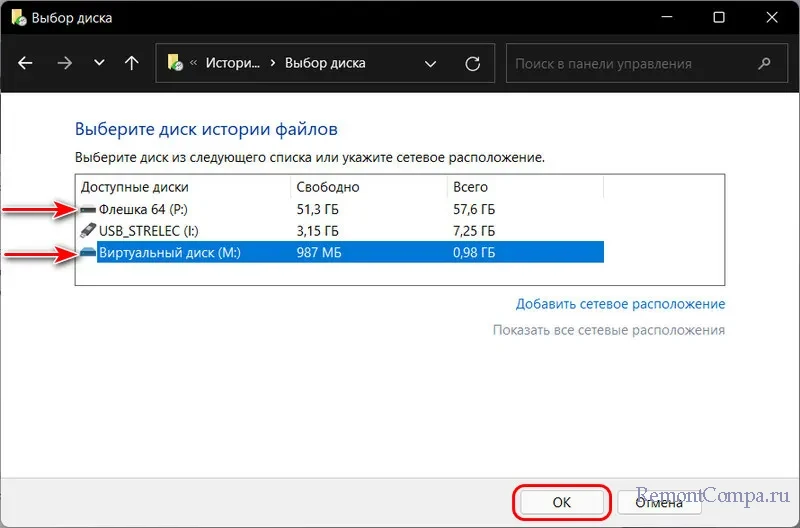 И выбираем нужный диск. В нашем случае, например, пригодными для участия в «Истории файлов» являются две флешки и подключённый виртуальный диск VHD. Можем выбрать либо последний, либо флешку с большим объёмом. И жмём «Ок».