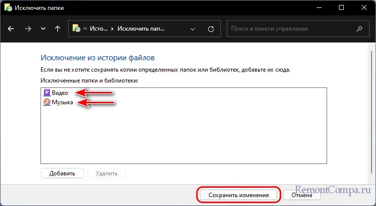Сюда вносим те папки из состава пользовательского профиля, для содержимого которых не нужно делать резервные копии. В нашем случае это папки «Видео» и «Музыка», в них содержится внушительная медиатека, бэкап которой будет занимать много места на диске-хранилище.