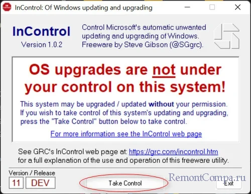 Сама утилита является портативной и устанавливать ее не требуется. Для запуска достаточно скачать InControl и запустить от имени администратора, кликнув ПКМ и выбрав соответствующую функцию. После открытия программы вам достаточно кликнуть по кнопке "Take Control" и приложение определит как основную версию Windows ту, которая установлена у вас на ПК. Если же вам захочется перейти на другой выпуск Windows, то необходимо отключить функцию "Take Control" и в левом нижнем углу указать необходимую версию, например, 11 21H1 можно изменить на 11 21H2. В таком случае, как только будет доступно обновление, система установит его, а затем будет скачивать только патчи безопасности.