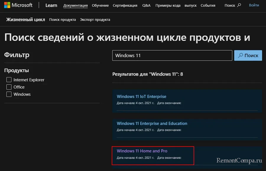 Теперь можем отправиться на сайт Microsoft и узнать, когда у этой или другой интересующей нас версии Windows 11 закончится поддержка. Заходим в раздел поиска сведений о жизненном цикле продуктов и служб на сайте документации Microsoft. Вписываем в поиск «Windows 11». Ищем свою редакцию. Кликаем её.