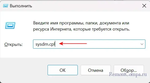 1. Жмем Win+R. Печатаем sysdm.cpl и подтверждаем.