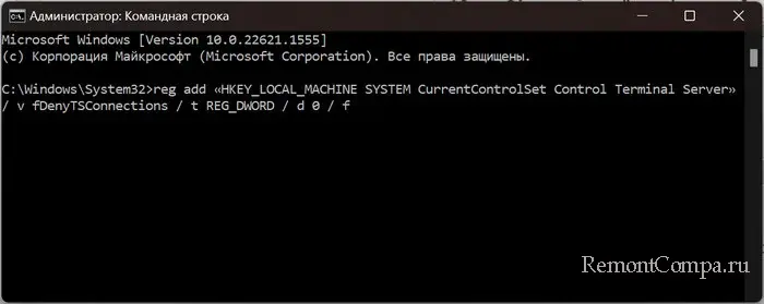 reg add «HKEY_LOCAL_MACHINE SYSTEM CurrentControlSet Control Terminal Server» / v fDenyTSConnections / t REG_DWORD / d 0 / f