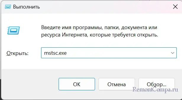 1. Нажимаем Windows+R. Вводим mstsc.exe. Жмем Enter.