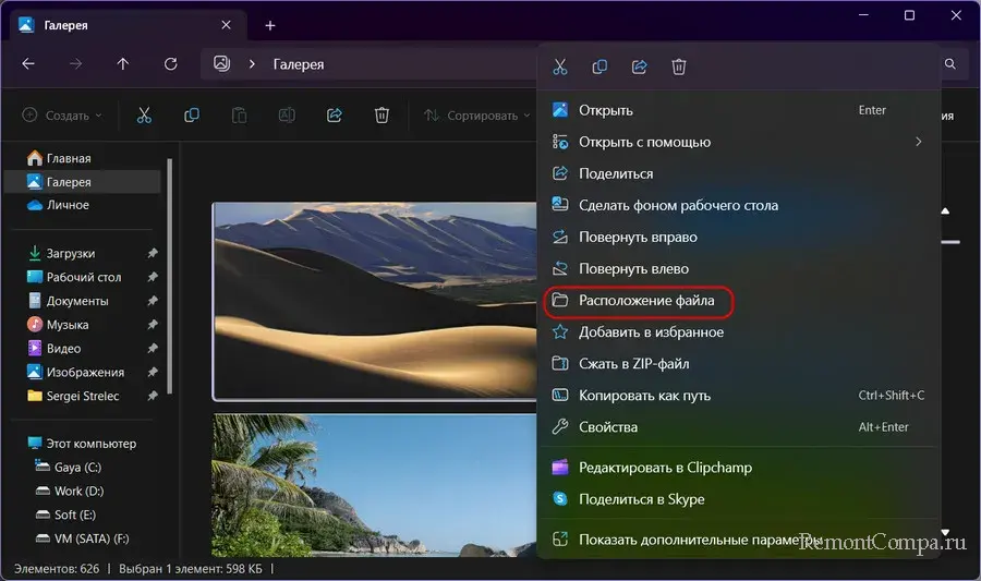 Галерея – особенная функция проводника Windows 11. Это только инструмент просмотра изображений, но не файловый менеджер. Для галереи недоступны многие из функций меню и контекстного меню проводника. У неё нет свойств, как у логических дисков и папок. Её нельзя добавить в архив. К ней нельзя предоставить общий сетевой доступ. В ней нельзя переименовывать изображения. Все эти операции выполняются с папками и изображениями в обычном формате проводника. И при большом количестве добавленных папок галерея может помочь нам оперативно открыть ту, в которой хранится нужное изображение. Контекстное меню на изображениях в галерее предусматривает дополнительный пункт «Расположение файла». Он открывает в обычном формате проводника путь папки с этим изображением.