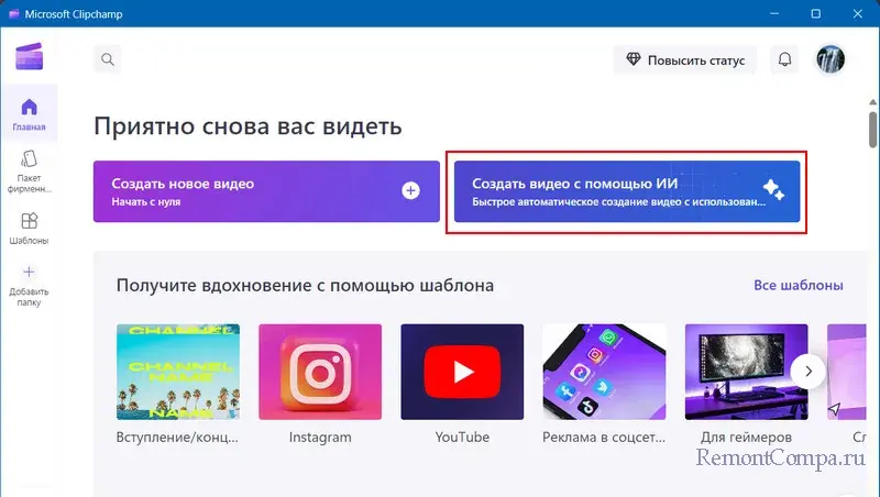 Для использования этой функции в Clipchamp жмём кнопку создания видео с помощью ИИ.