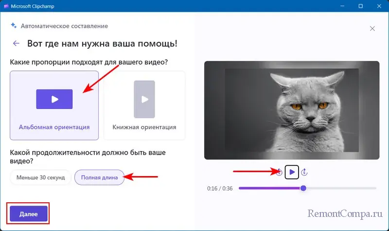 Далее от нас требуется выбрать ориентацию видео – альбомную или портретную (вертикальное видео). Можем выбрать продолжительность видео из предлагаемых вариантов – меньше 30 секунд, меньше минуты, другое количество минут (в зависимости от длины исходного видео) или полная длина. И всё – получаем результат в превью видео.