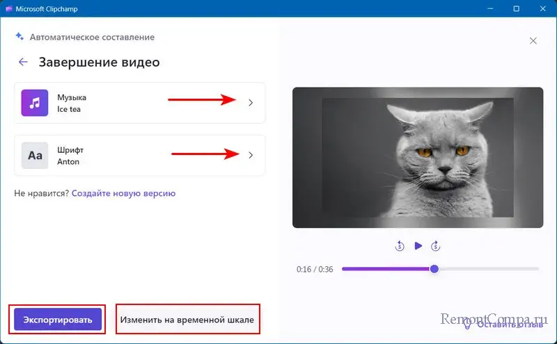 Фоновую музыку подбирает ИИ, но на следующем шаге можем убрать её или сменить на другую мелодию. Для слайд-шоу дополнительно предлагается выбор шрифтов, если ИИ использовал титры. В итоге готовое видео можем либо отправить на монтажный стол Clipchamp для доработки уже вручную («Изменить на временной шкале»), либо сохранить в файл («Экспортировать»).