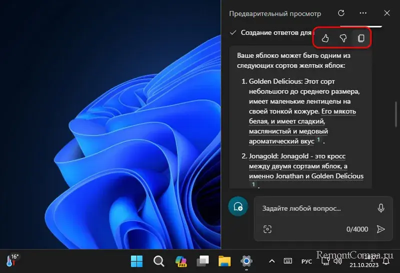 Можем копировать ответы ИИ. Можем ставить им лайки и дизлайки, что будет способствовать улучшению алгоритмов Copilot и совершенствовать его.