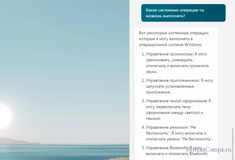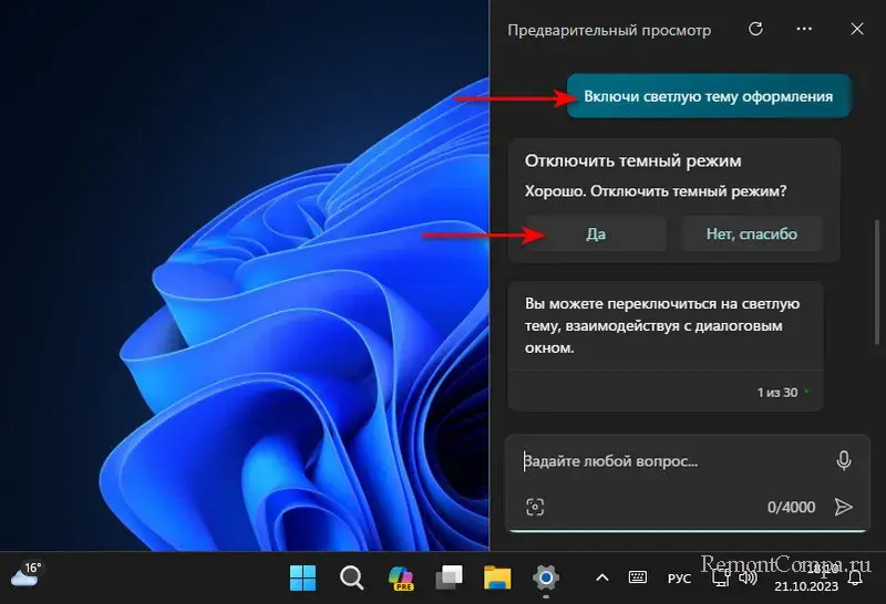 Можем попросить ИИ выполнить какие-то операции с Windows 11. Например, сменить тему оформления.