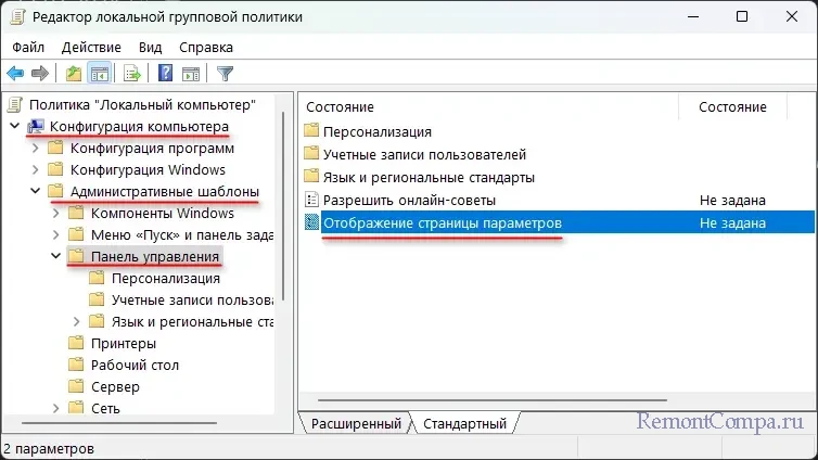 Конфигурация компьютера → Административные шаблоны → Панель управления