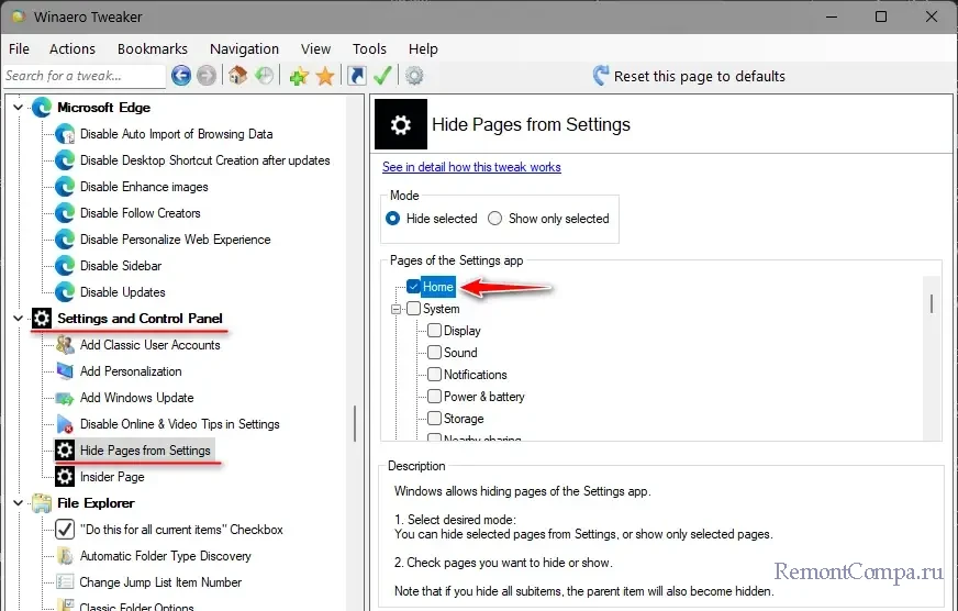 Это твик, предлагающий нам сокрытие разделов и подразделов приложения «Параметры». На панели справа отмечаем галочкой раздел «Home». Можем отметить другие разделы или подразделы приложения.