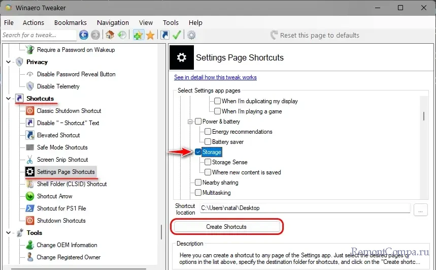 Это, собственно, твик, предлагающий нам создание ярлыков современных настроек Windows 11. На панели справа отмечаем галочками разделы и подразделы приложения «Параметры», которые нам интересны. Единственное, что придётся сопоставить русскоязычные названия настроек с англоязычными, поскольку Winaero Tweaker без поддержки русского. В итоге жмём «Create Shortcuts».