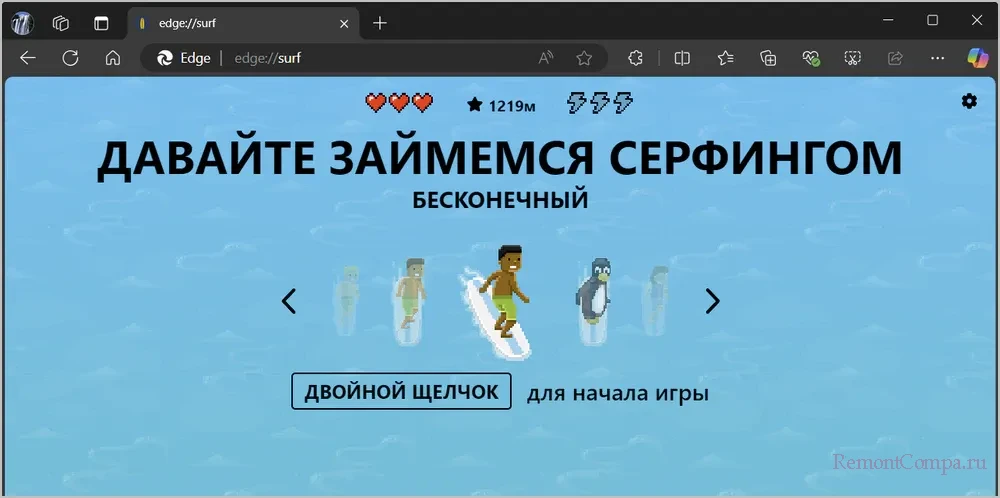 Чтобы поиграть в «Поймай волну», друзья, не нужно переустанавливать Windows 11. Эта игра - немногим более упрощённая версия игры «Поймай волну», являющейся пасхалкой браузера Microsoft Edge. Поиграть в эту пасхалку можно, введя в адресной строке Microsoft Edge: