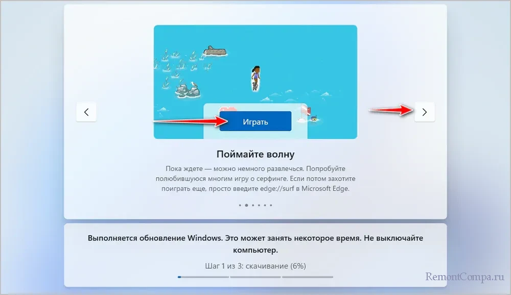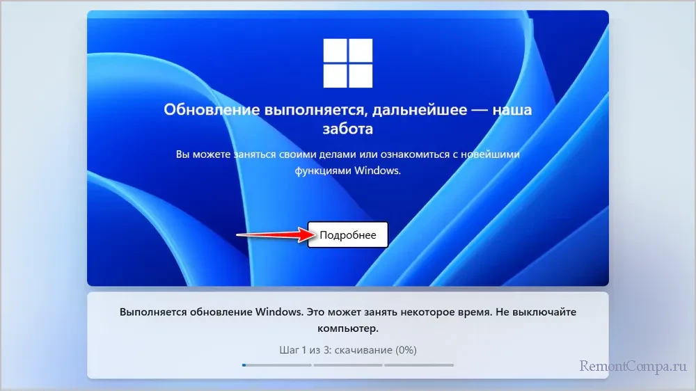 Игра «Поймай волну» будет доступна нам как при обычной установке Windows 11 с установочного носителя, так и при возврате Windows 11 в исходное состояние. У этих процессов разные способы запуска и стартовые этапы, но завершающий этап первичной настройки операционной системы идентичен. И, собственно, на этом этапе первичной настройки, после того, как мы выберем региональные параметры, назовём компьютер, выберем способ настройки (для личного использования, либо для работы или учёбы), нас и поджидает игра «Поймай волну». Но поджидает не явно. После всех этих шагов будем видеть прогресс скачивания и установки обновлений на фирменном экране Windows 11. На котором присутствует кнопка «Подробнее». Немногие любят подробности от Microsoft по её продуктам, но в этом случае эту кнопку нажать стоит.