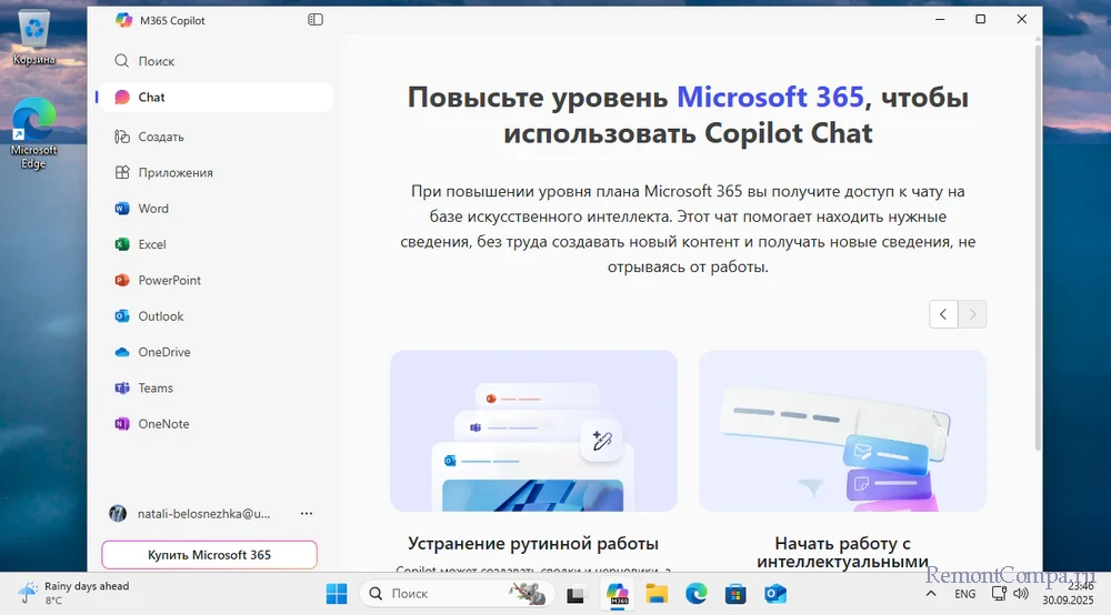 Прискорбно, друзья, но в Windows 11 25H2 вместо доступа к штатному нейросетевому ИИ-ассистенту Copilot, как это было в версии 24H2, мы получаем сервисы Microsoft 365 с уведомлением, что ИИ-ассистент теперь платный. Он станет доступен только после оформления платной подписки. И Copilot теперь даже называется Microsoft 365 Copilot. Microsoft уже давно позиционирует Copilot как часть экосистемы Microsoft 365, особенно для бизнес-кейсов, его полноценные возможности и ранее требовали платной подписки. Но возможности базовые были доступны бесплатно.