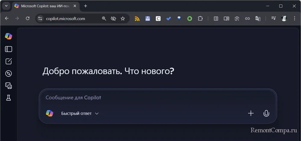 Ну и также бесплатный Copilot доступен нам в окне браузера или закреплённом на панели задач PWA-приложении на сайте ИИ-ассистента - copilot.microsoft.com.