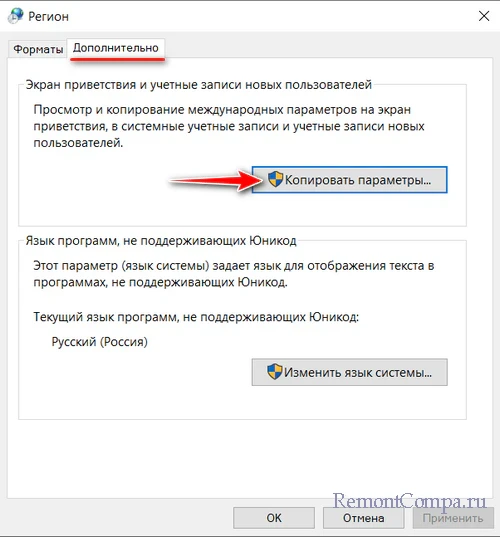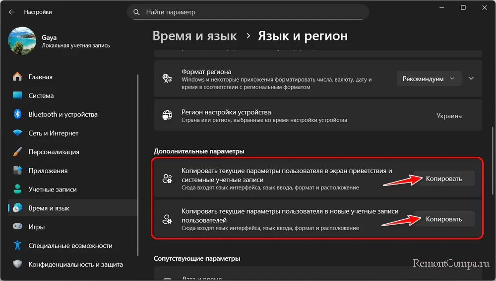 Ниже можем внести дополнительные параметры, связанные с регионом. Эти дополнительные параметры относятся не столько к самому региону, сколько к тому, как выбранные языковые и региональные настройки будут применяться в системе в целом. Можем скопировать текущие свои параметры на экран приветствия Windows 11 и системные учётные записи. И можем скопировать текущие свои параметры в новые учётные записи.