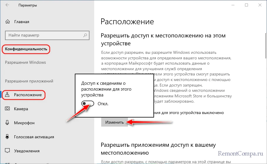 В пункте «Разрешить доступ к местоположению на этом устройстве» жмём «Изменить» и устанавливаем переключатель в положение «Откл.».