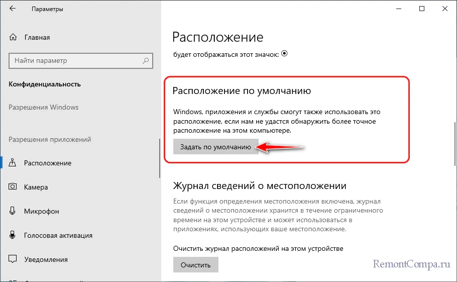 Ниже, в пункте «Расположение по умолчанию» можем вручную указать фейковое местоположение, кликнув кнопку «Задать по умолчанию».