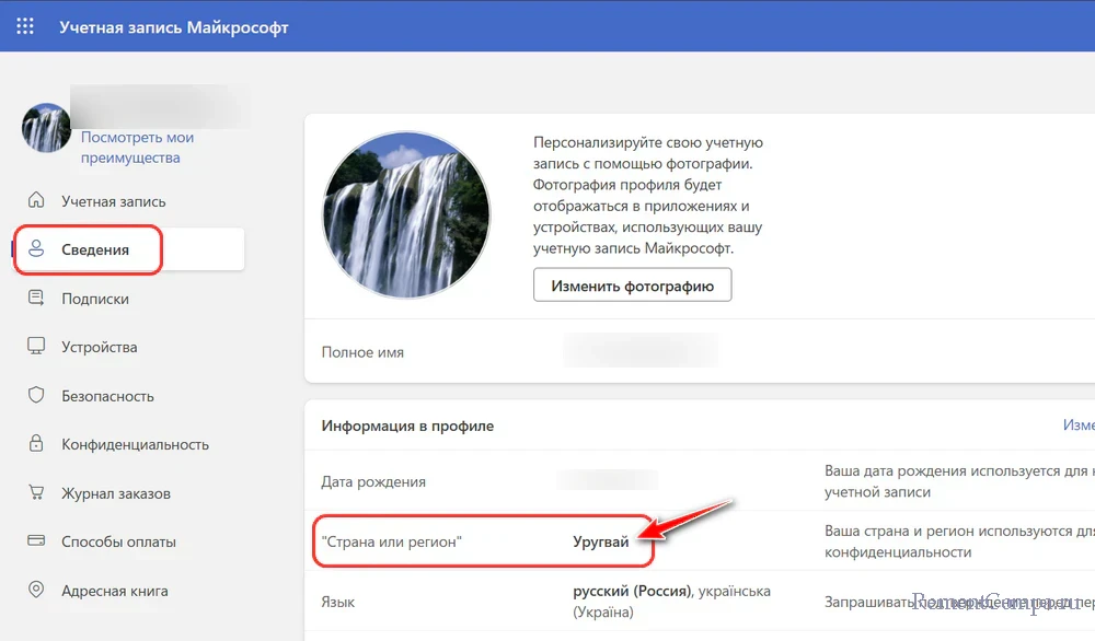 account.microsoft.comАвторизуемся в учётной записи Microsoft. В её веб-интерфейсе, в разделе «Сведения» нам нужен блок «Страна или регион», кликаем его.