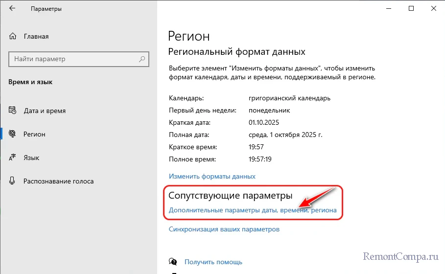 Ниже, как и в случае с Windows 11, также можем внести связанные с регионом дополнительные параметры. В блоке «Сопутствующие параметры» кликаем ссылку «Дополнительные параметры даты, времени и региона».