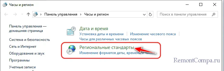 Откроется окно классической панели управления, кликаем в нём ссылку региональных стандартов.