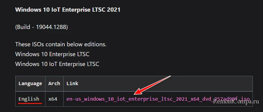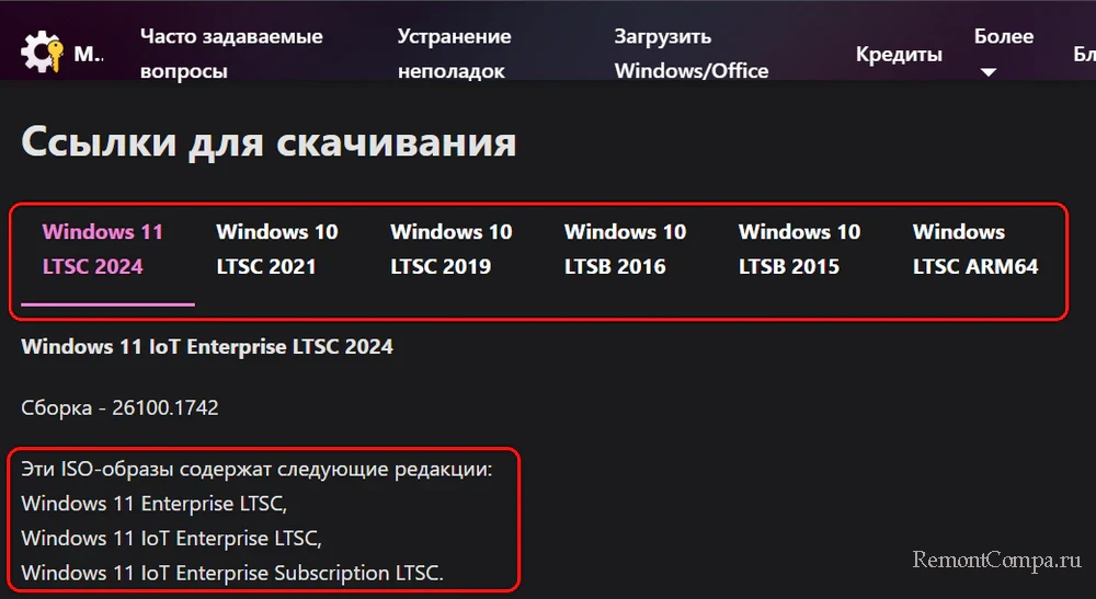 По этой ссылке https://massgrave.dev/windows_ltsc_links нам предлагается скачивание установочных ISO-образов всех возможных LTSC-выпусков Windows 10 и 11, в числе которых упомянутые выше актуальные выпуски. Для каждого LTSC-выпуска указывается перечень редакций, входящий в дистрибутив ISO-образа.