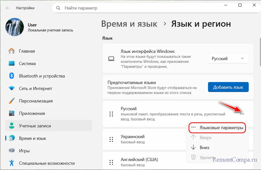 Способ 2. Если в Windows 11 уже имеются языки ввода русский и английский, нам доступно множество их дополнительных раскладок на, соответственно, кириллице и латинице. В перечне языков ввода жмём меню того или иного языка. Выбираем «Языковые параметры».