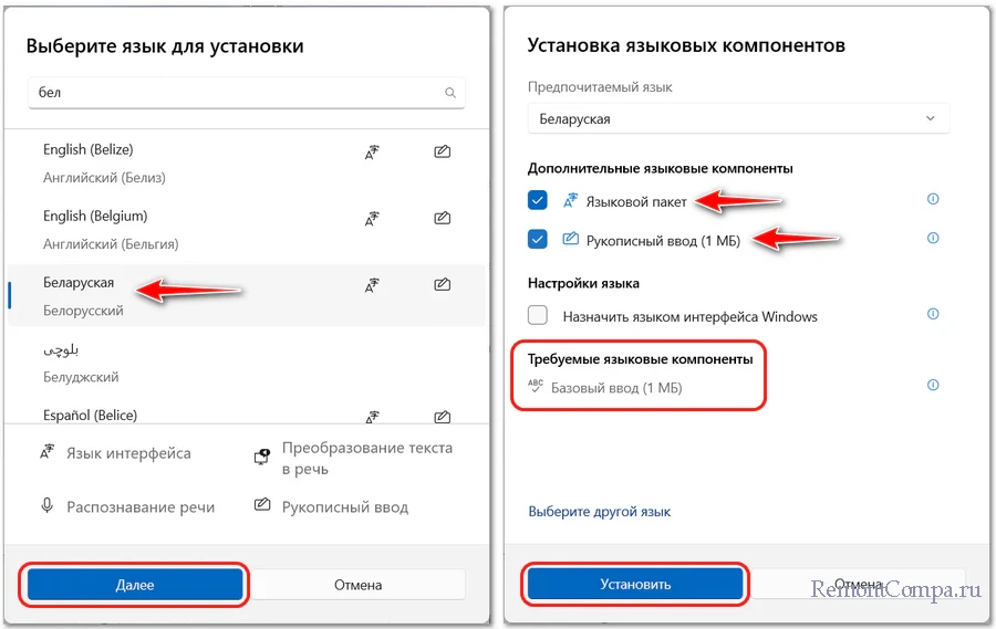 Выбираем язык, жмём «Далее». В настройках установки языковых компонентов можем снять галочки языкового пакета, рукописного ввода, прочих компонентов при наличии, оставив только базовый ввод. Который, собственно, и являет собой основную раскладку клавиатуры для этого языка. И жмём «Установить».