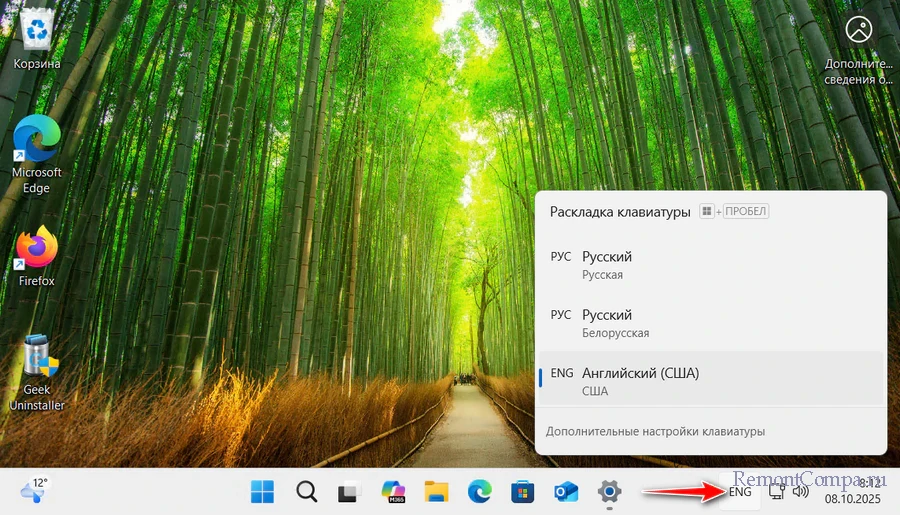 При добавлении раскладок на языковой панели в системном трее Windows 11 и основная, и дополнительные раскладки отображаются с привязкой к языку. Например, РУС RU (русская), РУС BE (белорусская).