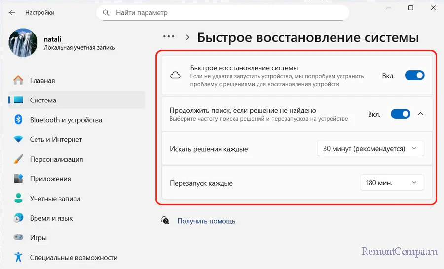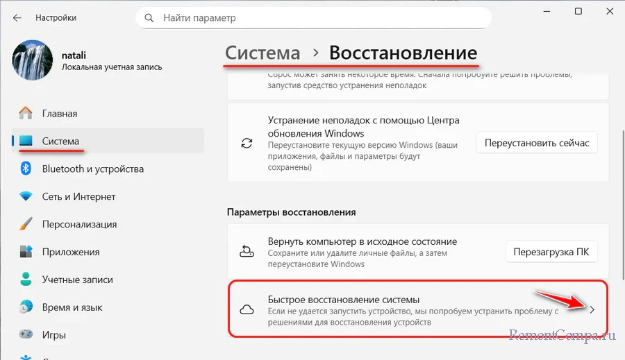Быстрое восстановление системы по умолчанию включено в редакциях Windows 11 Home. В высших редакциях начиная с Pro на данный момент по умолчанию активно старое автоматическое восстановление при загрузке. Заменить его новой функцией быстрого восстановления системы можно следующим образом. В системном приложении «Параметры» идём по пути:
