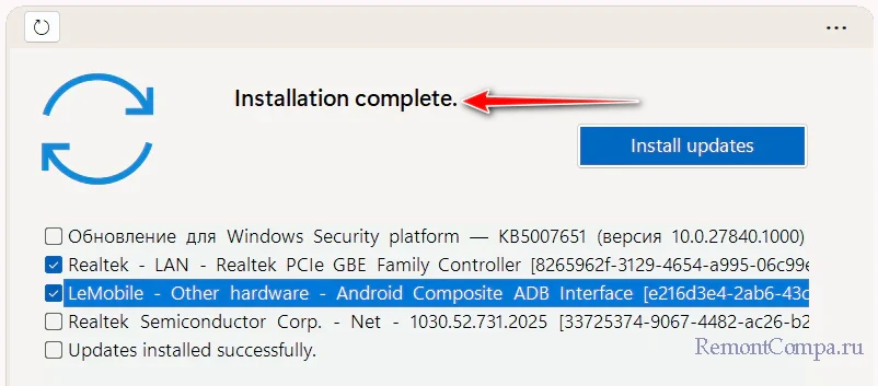 По итогу успешной установки будем видеть сообщение «Installation complete».