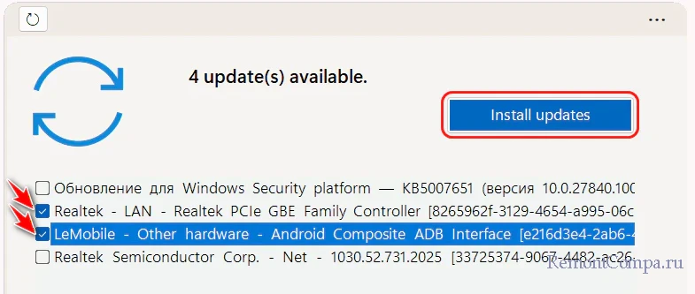 Устанавливаем галочки на обновлениях, которые хотим установить. Жмём «Install updates».