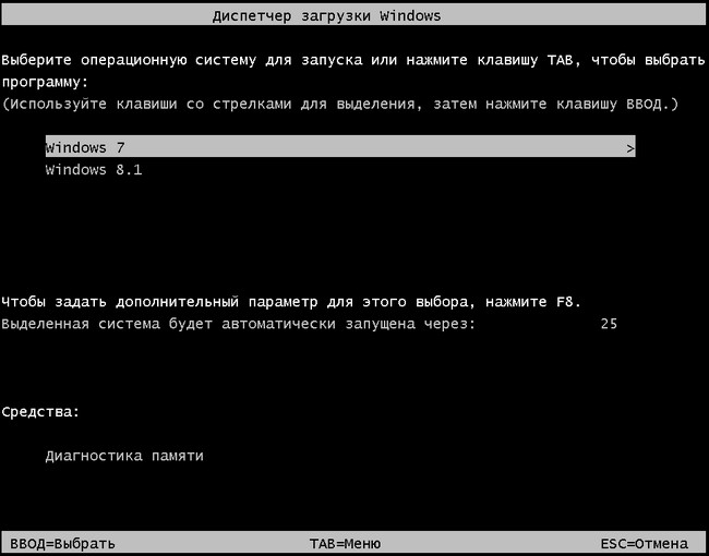 Теперь при перезагрузке и компьютера будет выходить вот такое меню, в котором мы можем выбрать для загрузки Windows 7 или Windows 8. Вот и всё.