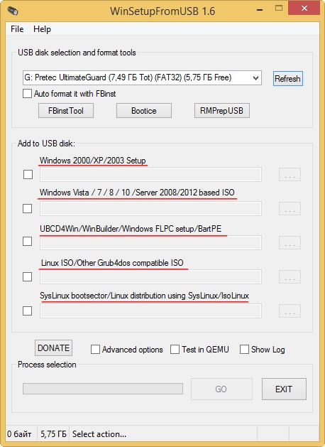 Если у вас новый ноутбук с включенным интерфейсом UEFI, то ноутбук прекрасно загрузится с этой флешки, но если UEFI отключен или вы пытаетесь загрузить обычный компьютер с простым BIOS, то появится ошибка при загрузке «No bootable device insert boot disk and press any key». Открываем утилиту WinSetupFromUSB