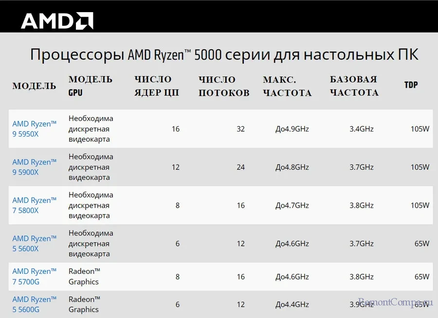 Для справки: актуальное ныне поколение десктопных процессоров – это Ryzen серии 5000 от 2020 года, которое включает всего несколько моделей из линеек Ryzen 5, 7 и 9. Серия создана специально как класс игровых процессоров на базе высокопроизводительной архитектуры Zen 3. В этой серии принципиально нет процессоров Ryzen 3, таковые присутствуют в предшествующих поколениях Ryzen 4000 и 3000 на базе архитектуры Zen 2. Ryzen 5000 выполнены по 7-нм процессу, что в связке с Zen 3 положительно сказалось на энергоэффективности процессоров. Имеют поддержку PCI-E 4.0, работают с оперативной памятью DDR4 3200 МГц. Две старшие модели Ryzen 5000 - Ryzen 9 5950X и Ryzen 9 5900X – до недавнего времени были лидерами среди игровых процессоров, пока в конце 2022 года их не сверг с пьедестала представитель 12-го поколения Intel, самый мощный игровой процессор на сегодня - Core i9-12900K. Максимальная частота ядра из этой серии у Ryzen 9 5950X – 4.9 ГГц.