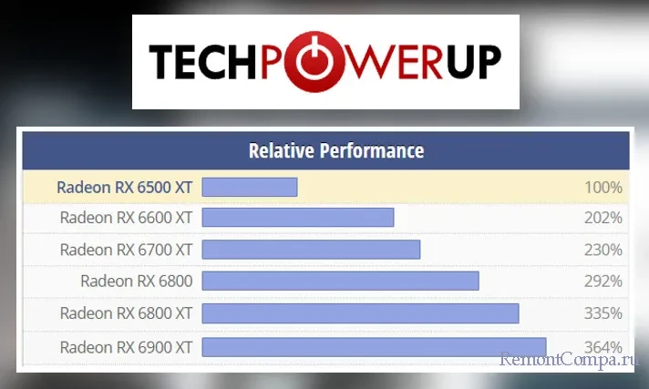 По данным бенчмарка TechPowerUp Radeon RX 6500 XT моделям из своей серии проигрывает непропорционально большой процент производительности. Тогда как между старшими моделями разница составляет 30-60% производительности, разница между RX 6500 XT и следующей за ней RX 6600 XT составляет 102% в пользу последней. Т.е. новинка в два раза слабее модели начального среднего сегмента.