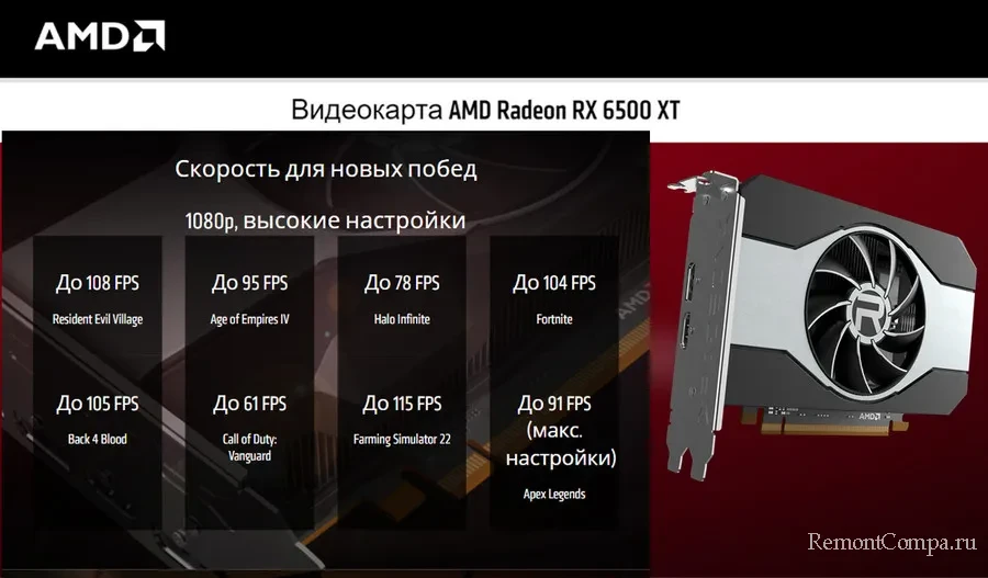 На официальной страничке Radeon RX 6500 XT компания AMD как может нахваливает своё детище. Выбрала далеко не самые требовательные игры и обещает в них в Full HD на высоких настройках до 115 FPS.