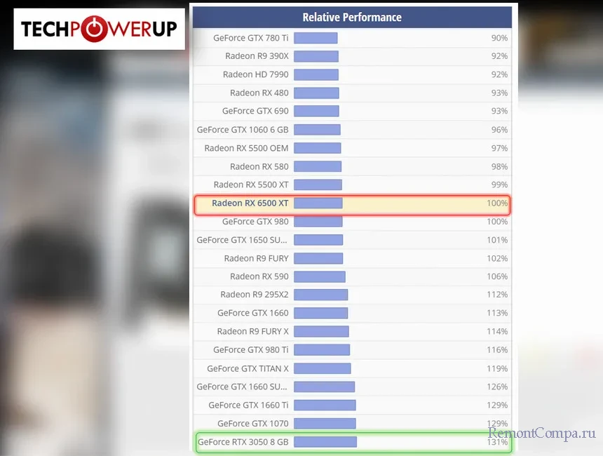 Давайте объективно рассмотрим производительность видеокарты. В рейтинге бенчмарка TechPowerUp Radeon RX 6500 XT лишь на 1% опережает предшественницу Radeon RX 5500 XT. В числе уступающих ей соседей также: Radeon RX 580 из 2017 года, GeForce GTX 1060 6 Гб из 2016 года, GeForce GTX 690 из 2012 года. Немногим опережающие Radeon RX 6500 XT соседи: GeForce GTX 980 из 2014 года, GeForce GTX 1650 Super из 2019 года, Radeon RX 590 из 2019 года. Недавно вышедшей видеокарте начального уровня GeForce RTX 3050 от Nvidia карта Radeon RX 6500 XT проигрывает 31% производительности.