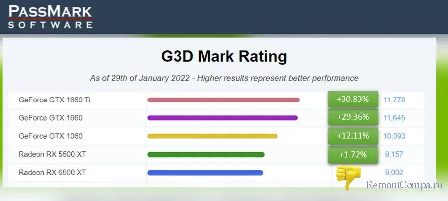В рейтинге бенчмарка PassMark ситуация с Radeon RX 6500 XT заметно хуже, она проигрывает соседям по бенчмарку TechPowerUp, даже тем, которых опережала, включая собственную предшественницу Radeon RX 5500 XT.