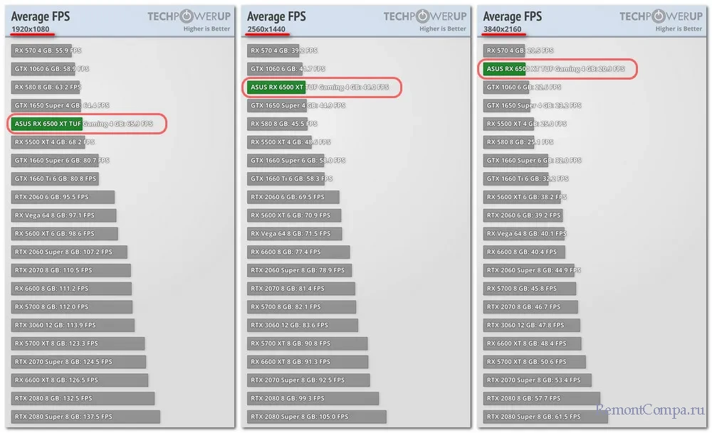 В рейтинге бенчмарка TechPowerUp по среднему значению FPS в разрешении Full HD на максималках Radeon RX 6500 XT со значением в 65.9 FPS проигрывает предшественнице RX 5500 XT, но вместе с ней опережает GeForce GTX 1650 Super. В разрешении 2 К на максималках Radeon RX 6500 XT со значением 44 FPS проигрывает и RX 5500 XT, и GeForce GTX 1650 Super, и даже Radeon RX 580. А в разрешении 4К на максималках Radeon RX 6500 XT со значением 20.9 FPS проигрывает уже всем своим соседям, даже GeForce GTX 1060 6 Гб.