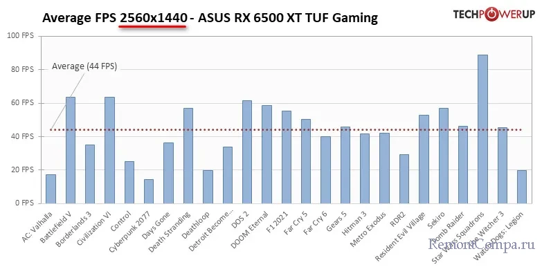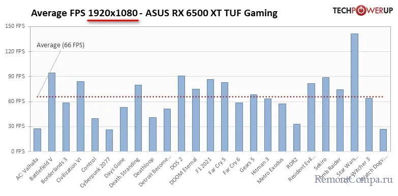 Давайте посмотрим на FPS Radeon RX 6500 XT в конкретных играх. В тестах TechPowerUp участвовали игры как то: Assassin's Creed Valhalla, Battlefield V, Borderlands 3, Civilization VI, Control, Days Gone, Cyberpunk 2077, Deathloop, Death Stranding, Detroit Become Human, Divinity Original Sin II, DOOM Eternal, F1 2021, Far Cry 5, Far Cry 6, Gears 5, Hitman 3, Metro Exodus, Red Dead Redemption 2, Resident Evil Village, Sekiro: Shadows Die Twice, Shadow of the Tomb Raider, Star Wars Squadrons, The Witcher 3, Watch Dogs Legion. В Full HD на максималках лишь половина игр пошла с FPS от 60 и выше. Средний FPS составил 66.