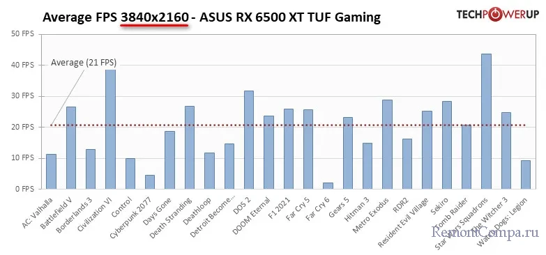 В 4К на максималках Radeon RX 6500 XT выдала полную жесть: ни одна игра не смогла выдать 60 FPS, а средний FPS составил 21.