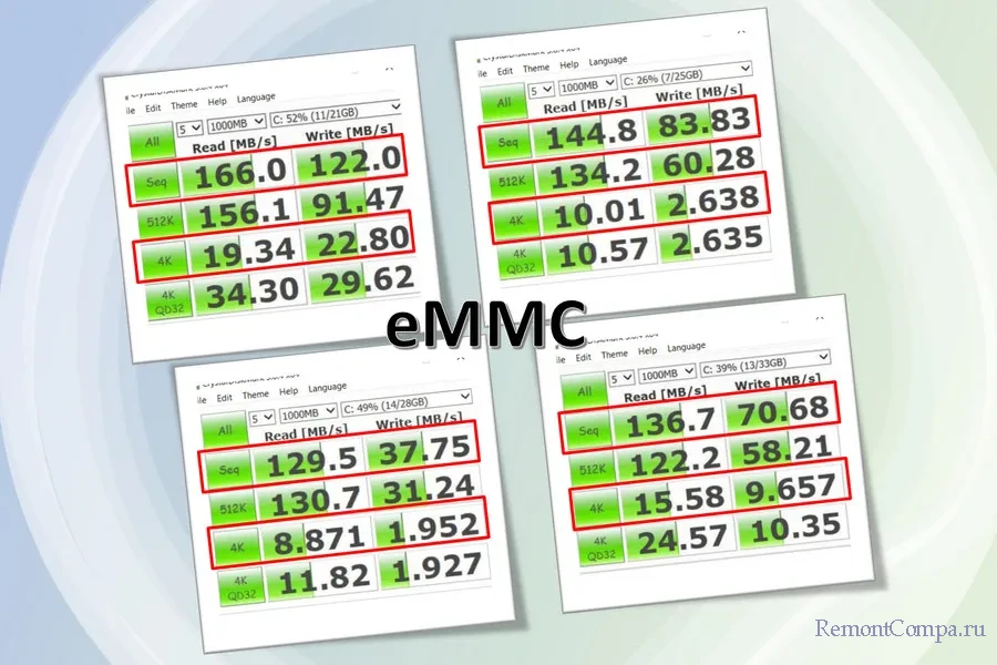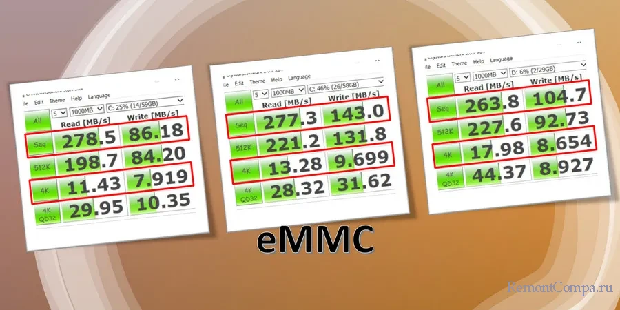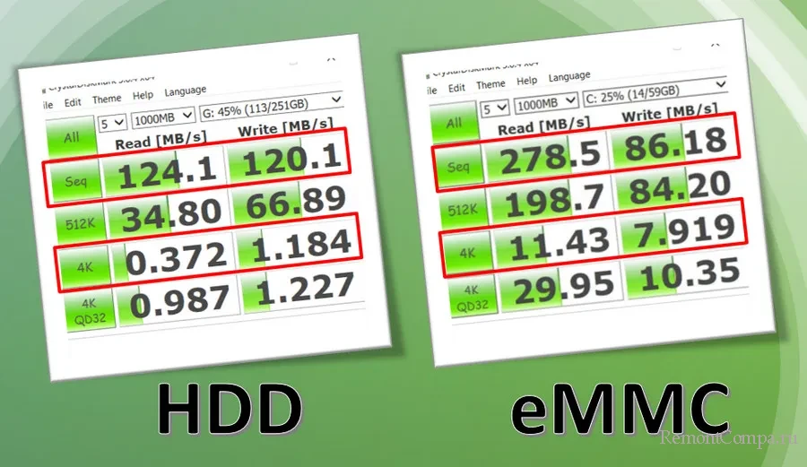 Т.е., как видим, даже самая быстрая память eMMC версии 5.1, имея точно такую же пропускную способность, как и SATA-интерфейс, в деле не использует её даже наполовину. Но, конечно, современная eMMC – это лучше, чем HDD. Взгляните на сравнение скоростей в CrystalDiskMark eMMC и HDD. Да, в последовательной записи eMMC есть куда расти, но она более, чем в 2 раза производительнее в последовательном чтении. И в десятки раз выигрывает у HDD в обработке мелких файлов.